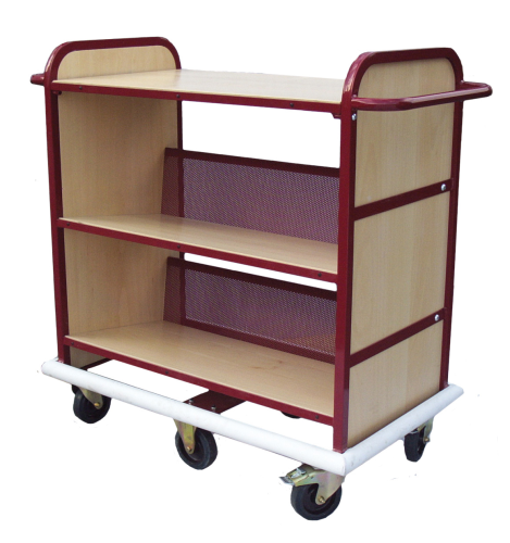 The Arrow range of trolleys have welded steel frames with wooden ends and shelves with perforated metal backs. There are double sided and single sided versions and the option of a flat shelf at either top or bottom if preferred. The desk side models are proving to be particularly popular. Trolleys are fitted with 125mm diameter top quality roller bearing castors. Brake castors can be fitted as optional extras for £10 per trolley. Rubber buffers can be fitted for £10 extra per trolley. A range of colours are available. Large Single Sided Book Trolley H 1100mm L 1000mm W 520mm